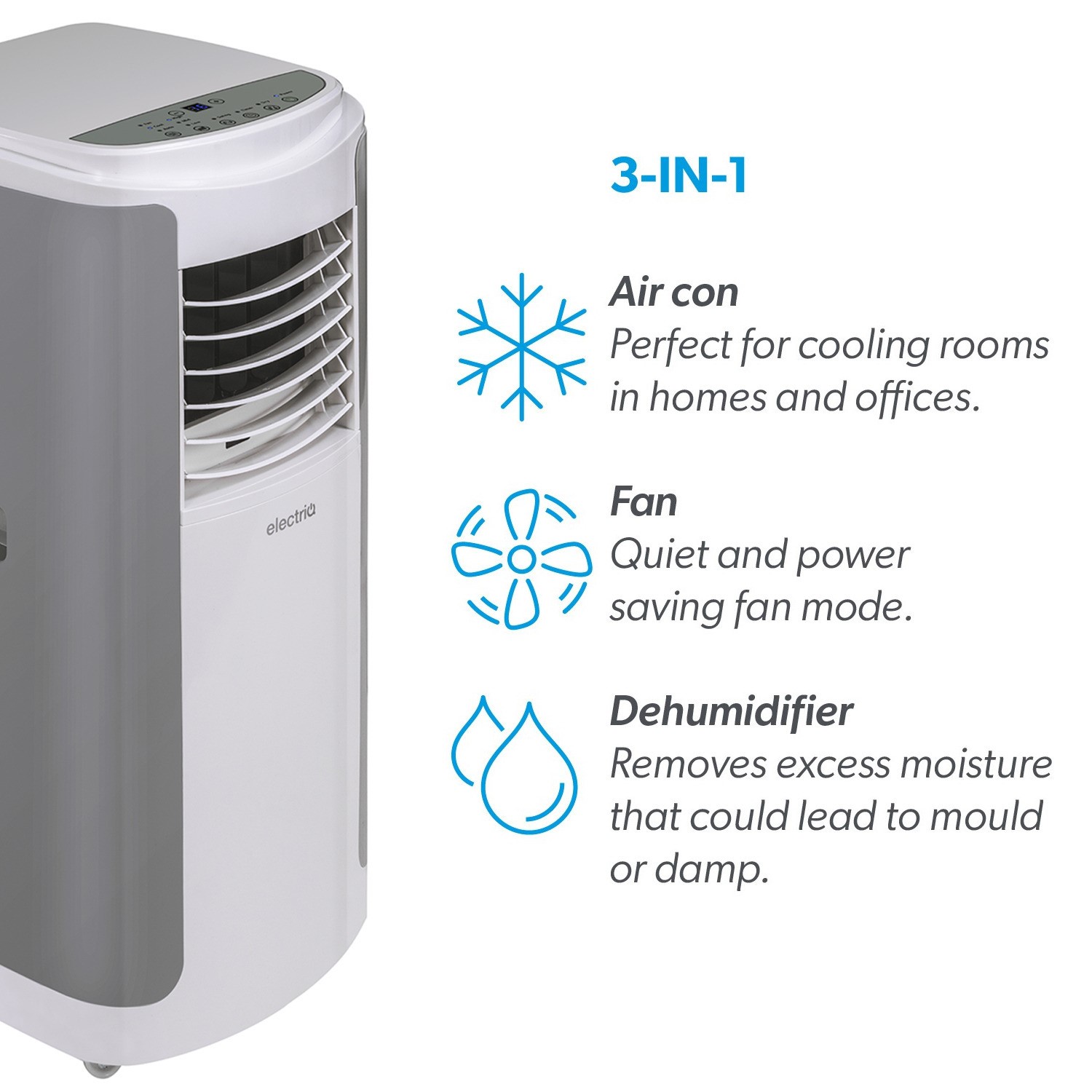 This stylish 3-in-1 air conditioner packs enough power to cool rooms up to 30 sqm (322 sqft) without taking up too much floor space. Switch to fan-only mode and control the output with the 3 available speeds - great for personal cooling. The unit also has a dehumidifier mode to help you dry laundry faster or tackle damp and mould in your home.