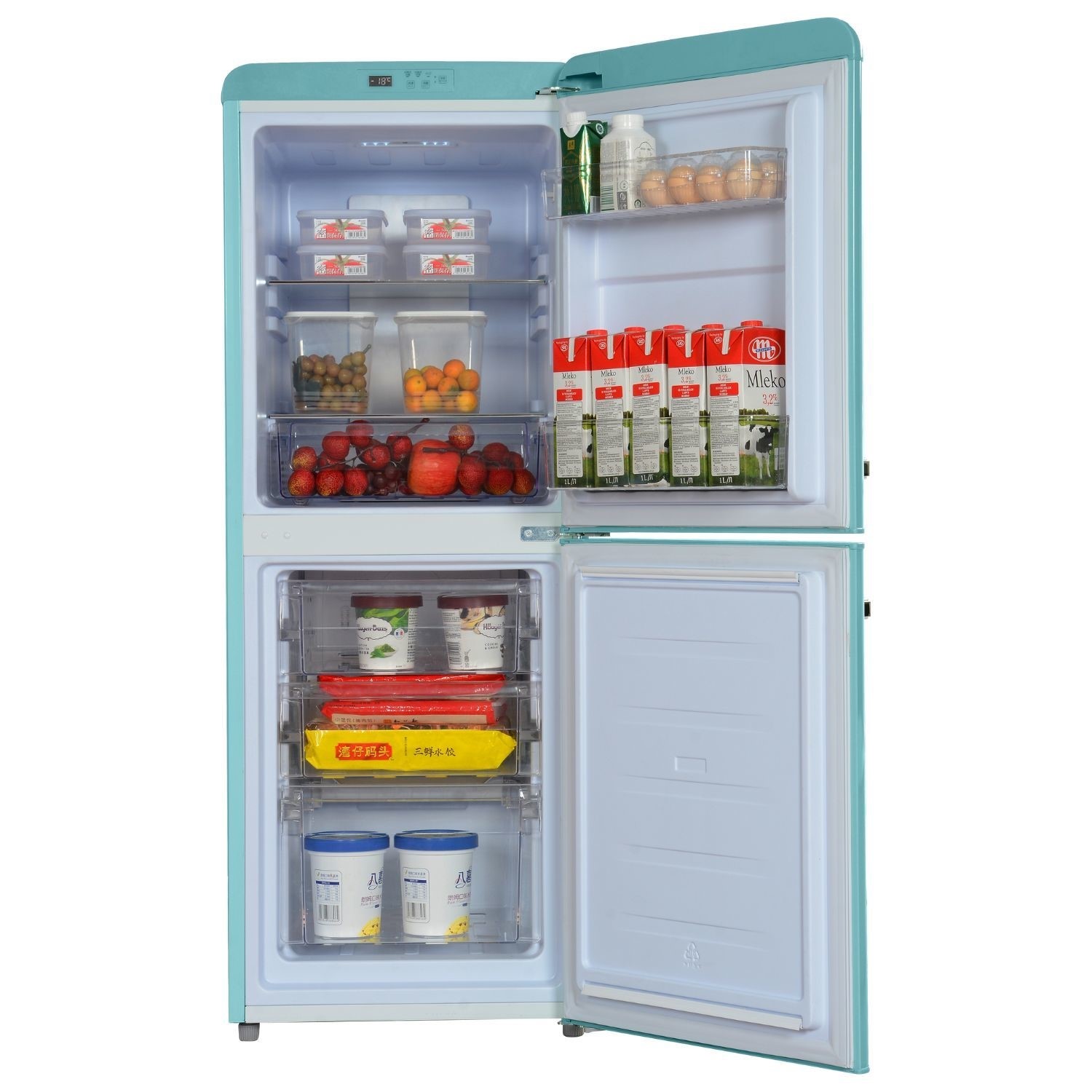 This stylish freestanding fridge freezer combines a retro-inspired design with modern features, making it an excellent choice for anyone seeking an aesthetic yet functional addition to their kitchen. Its blue-colored finish, paired with chrome handles, gives it a timeless look. With 153L of total storage capacity, this appliance is perfectly sized for smaller households or as a secondary unit. The 93L fridge compartment includes one shelf, a crisper drawer, and door balconies for organizing your essentials. The 60L freezer section offers three transparent drawers, making it easy to sort and access frozen goods.