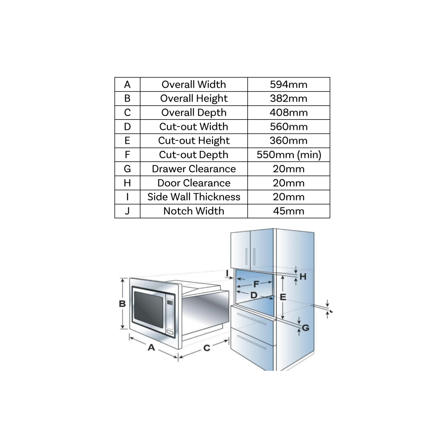 This microwave oven includes a 2200W convection oven and a 1200W grill, ideal for finishing off meals. It fits seamlessly into your kitchen, meaning less clutter on your worktop and includes a plug for easy installation.