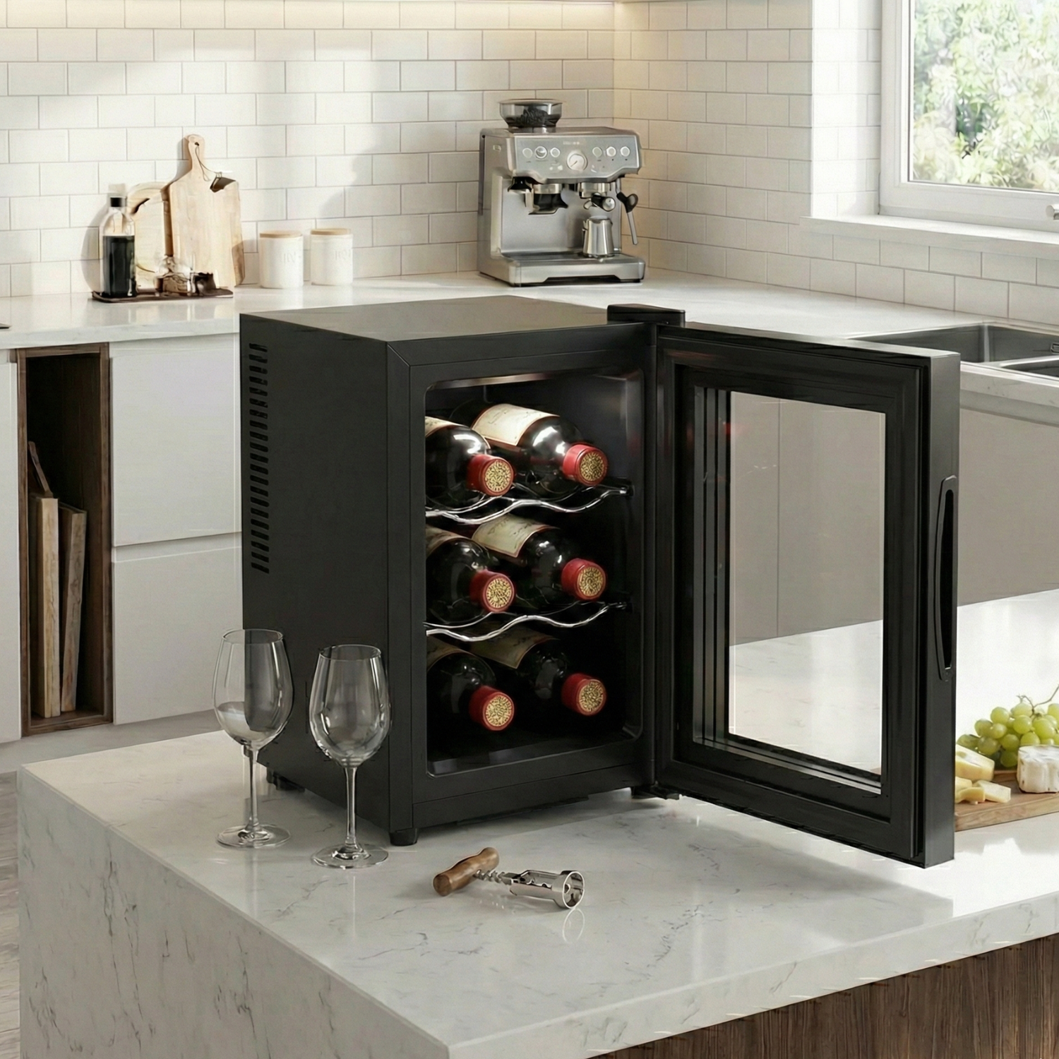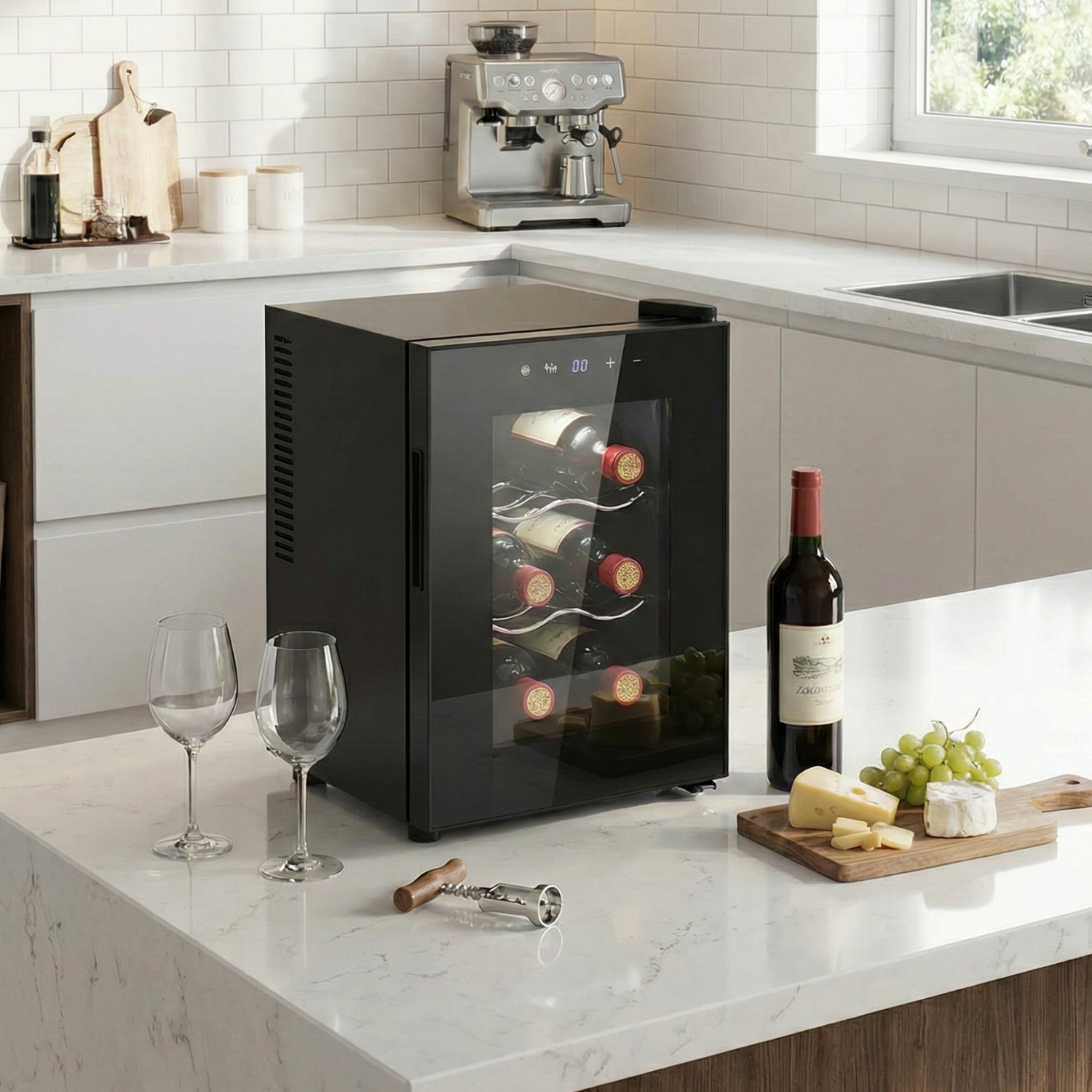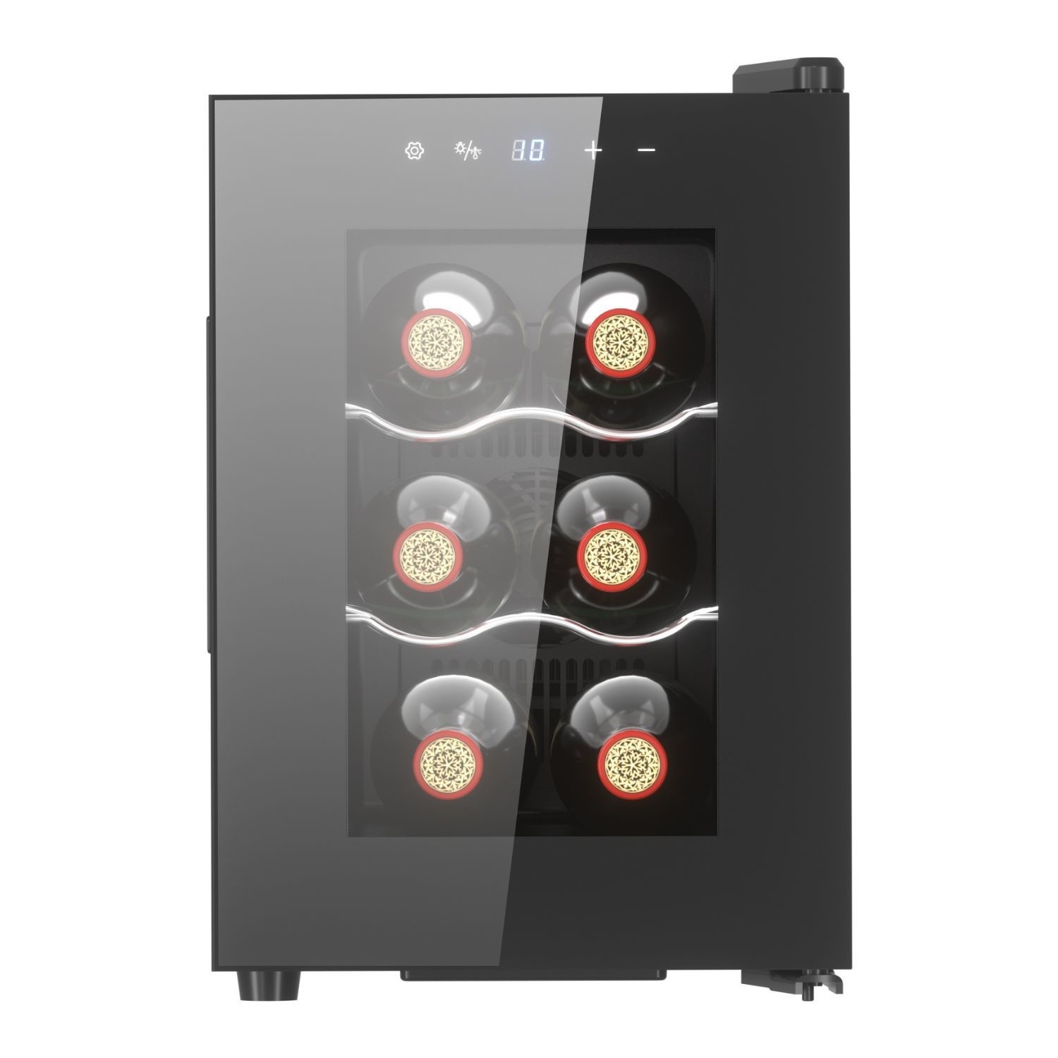 Keep your small wine collection perfectly chilled with this electriQ 6-bottle freestanding wine cooler. Its compact design makes it ideal for kitchens, offices, or apartments where space is limited. The sleek black finish and slide-out shelves offer both style and convenience, while the low operating noise of just 35 dB ensures quiet performance. This model features a dual chip thermoelectric cooling system, offering a temperature range of 5 – 18 °C, which is wider than standard thermoelectric units—comparable to compressor models. The touch control LED display allows for precise and easy temperature adjustments, adding to its modern appeal. With freestanding installation, this cooler is a great choice for anyone seeking a reliable and stylish way to store their favorite bottles.