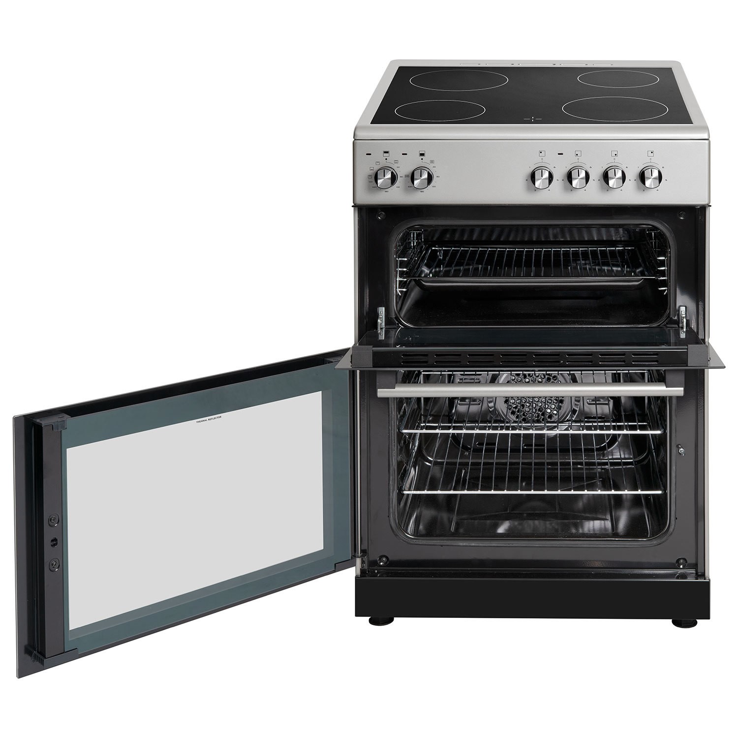 The easy-clean enamel interior and removable glass doors make maintenance effortless, while the sleek silver finish brings a modern touch to any kitchen. Designed for long-lasting performance and energy efficiency, this cooker is a reliable and stylish addition to your home.