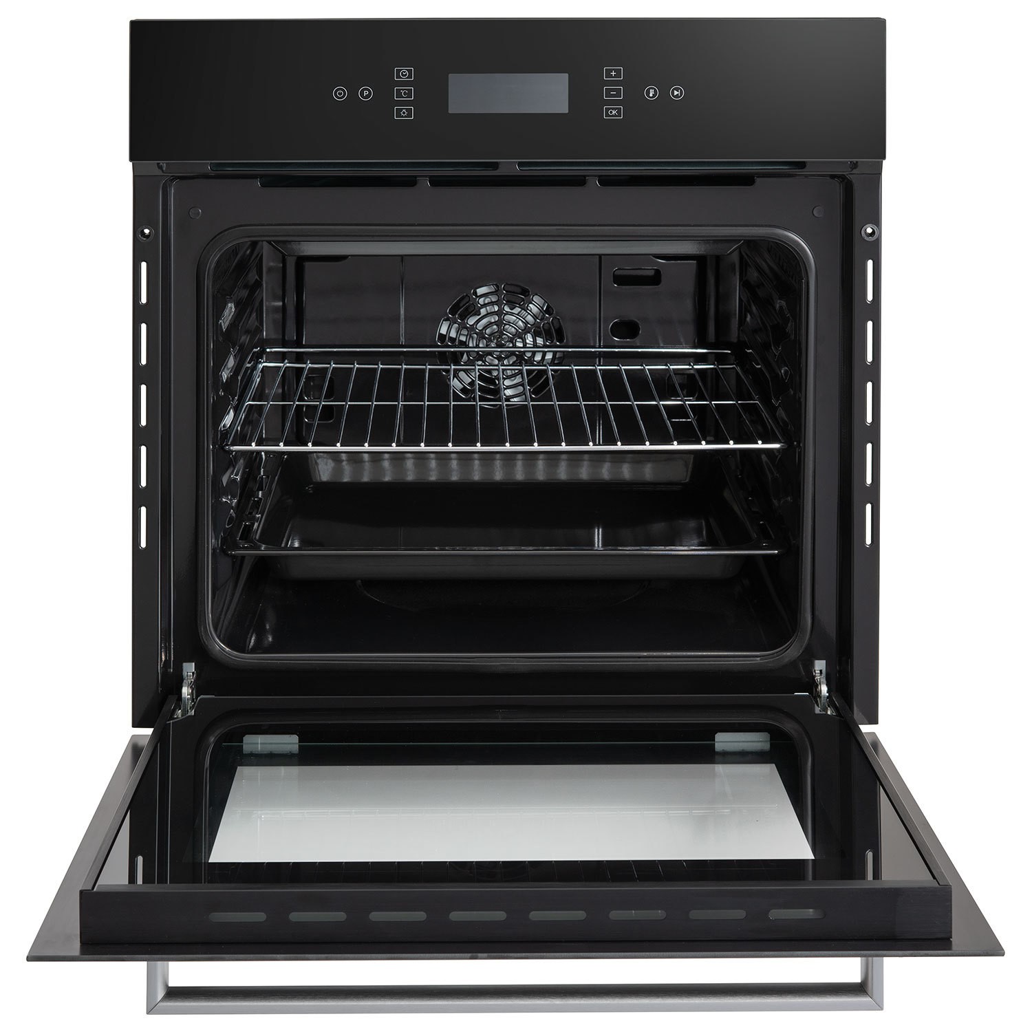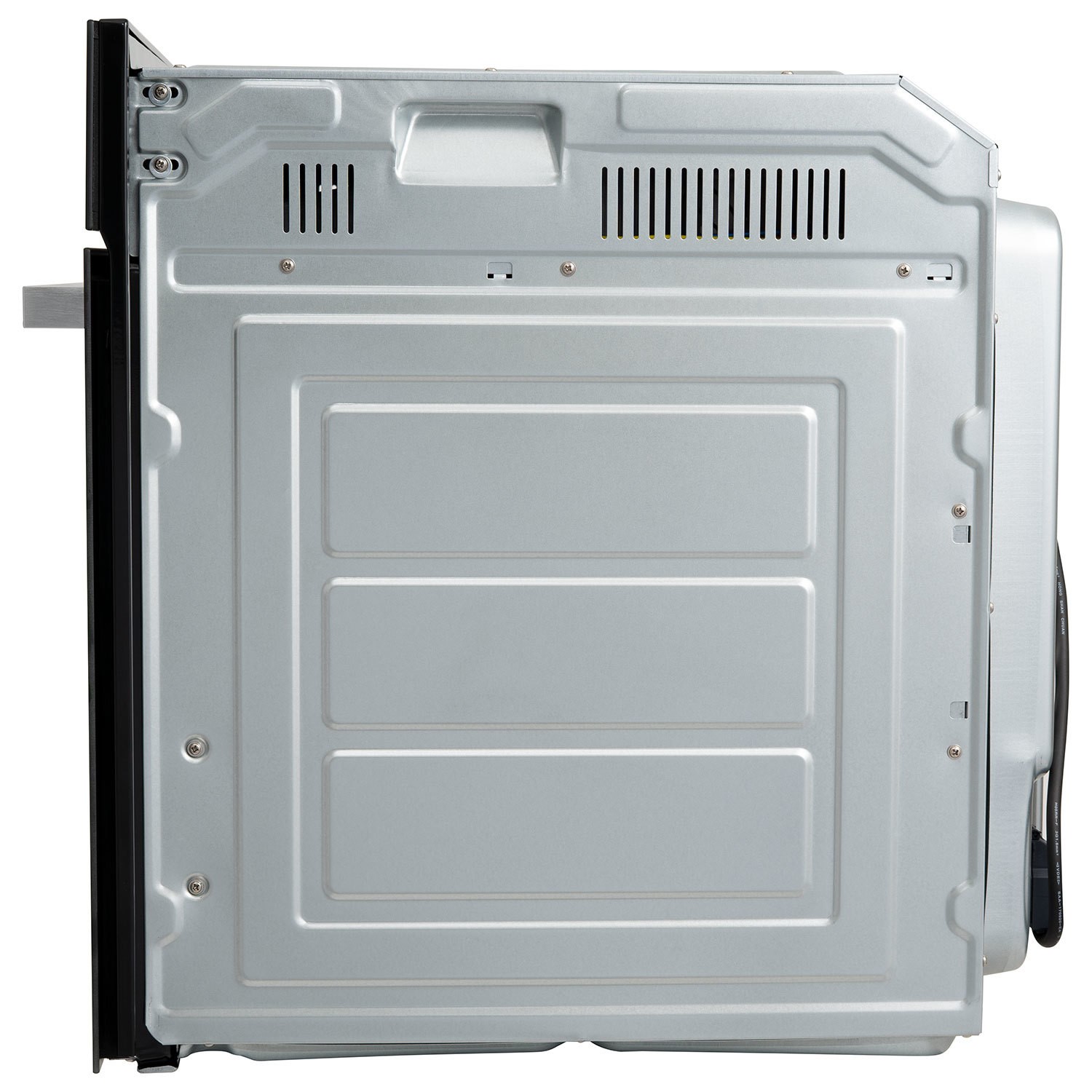 The triple-glazed drop-down door keeps the heat inside while remaining cool to the touch, ensuring safety and energy efficiency. Its enamel interior makes cleaning simple, while the programmable timer allows for precise cooking control. Designed for built-in installation, it fits seamlessly into your kitchen cabinetry, combining practicality with a sophisticated black finish.