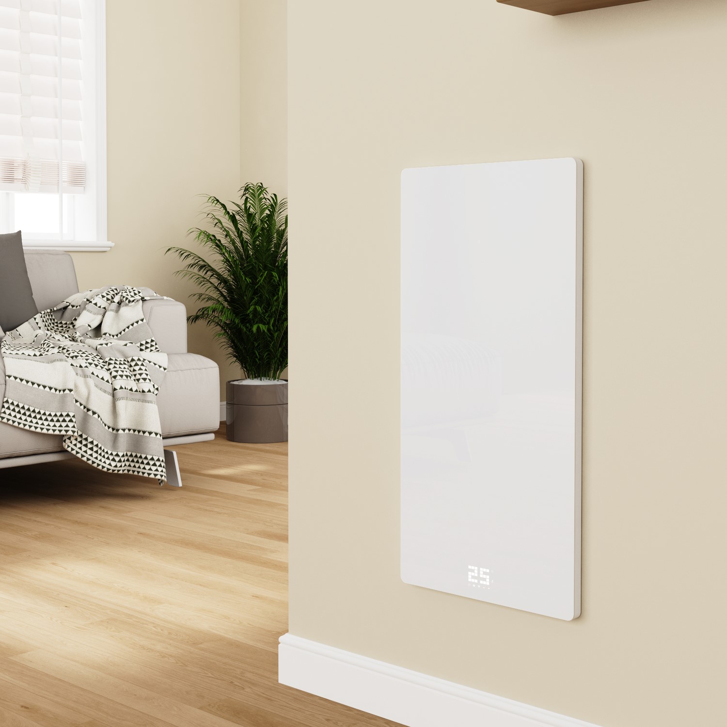 • Sleek 600w white designer heater with tempered glass panel